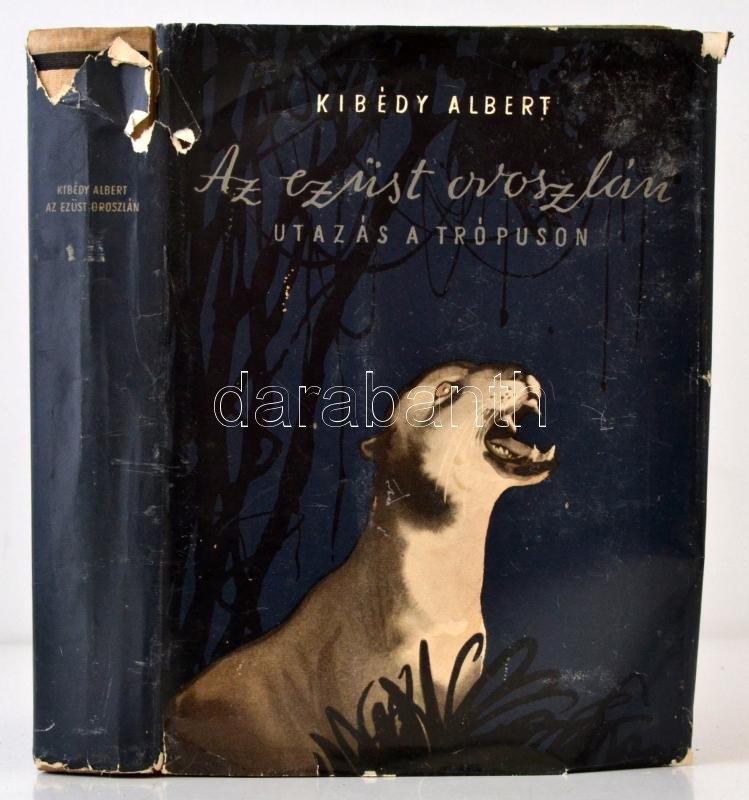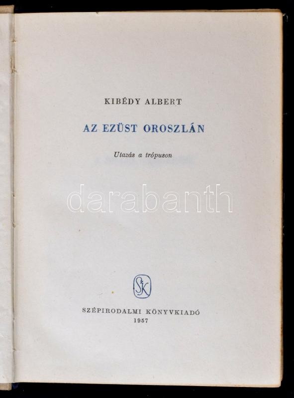 Kibédy Albert: Az ezüst oroszlán. Utazás a trópuson. Budapest, 1957, Szépirodalmi Könyvkiadó. Kiadói egészvászon szakadozott kiadói papírborítóban, 467 p. A papírborítója szakadozott. A könyvben egy meglazult a 113-144 p. között. A lapélek foltosak.