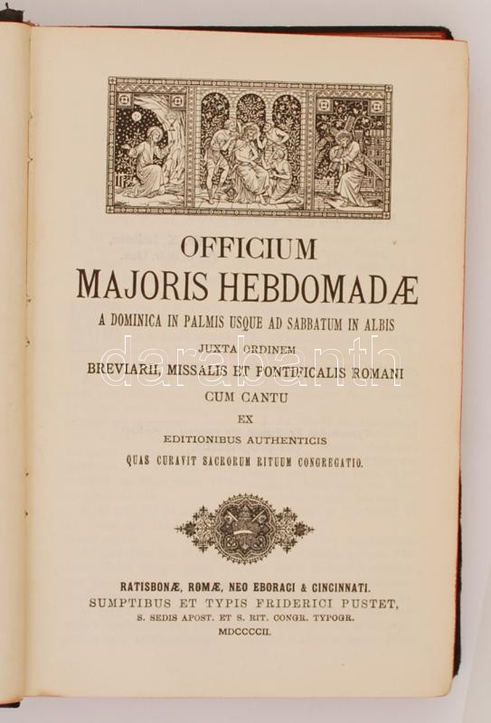 Officium majoris hebdomadae a dominica in Palmis usque ad sabbatum in Albis. Regensburg - Roma - New York - Cincinnati, 1902, Friedrich Pustet. Aranyozott gerincű, kicsit kopott vászonkötésben, egyébként jó állapotban.