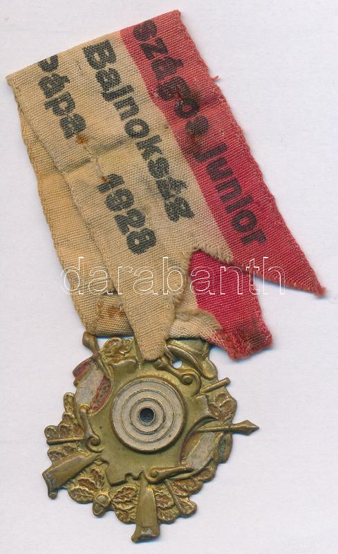 1928. "Országos Junior Bajnokság - Pápa 1928" festett Br cél... https://www.darabanth.com/hu/272-Gyorsarveres/272.0/Numizmatika/Falerisztika-Kituntetesek-jelvenyek~300017/1928-Orszagos-Junior-Bajnoksag--Papa-1928-festett-Br-cellovo-sport-dijerem-szalagon-33~II1386271