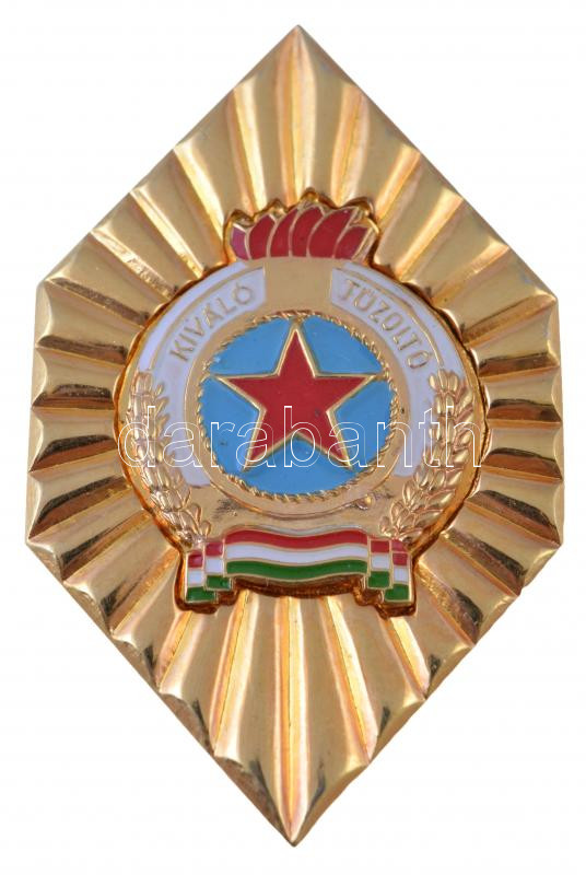 ~1980. "Kiváló Tűzoltó" aranyozott, zománcozott fém jelvény ... https://www.darabanth.com/hu/272-Gyorsarveres/272.0/Numizmatika/Falerisztika-Kituntetesek-jelvenyek~300017/7E1980-Kivalo-Tuzolto-aranyozott-zomancozott-fem-jelveny-30x45mm-T1-~II1381504