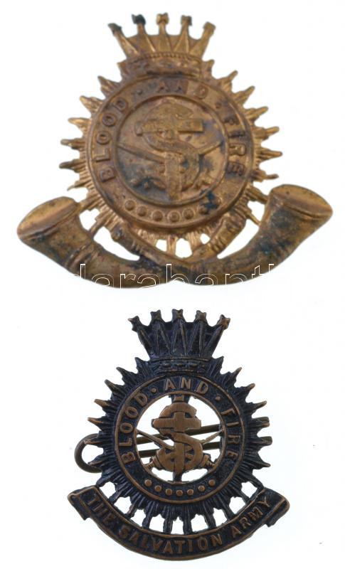DN "Vér és Tűz" Üdvhadsereg fém sapkajelvény (51x56mm) + DN "Vér és Tűz - Üdvhadsereg" fém sapkajelvény (35x40mm) T:2 oxidáció