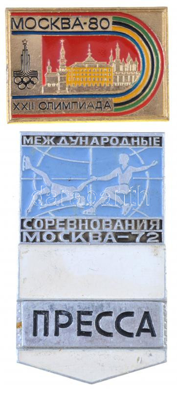 Leírás: Szovjetunió 1972. "Nemzetközi Műkorcsolya Verseny - Moszkva 72 - Újságíró" fém jelvény + 1980. "Moszkvai Olimpia" fém jelvény T:2