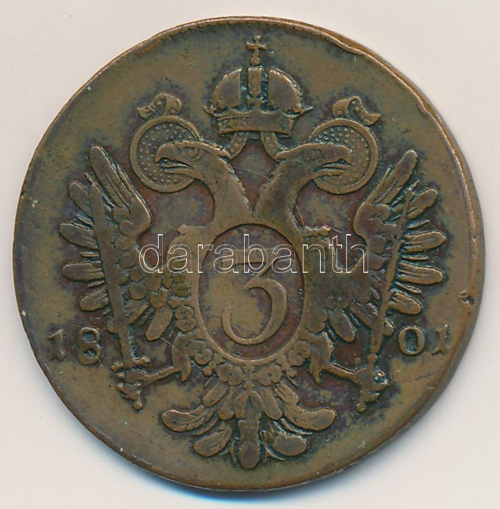 Austria 1801F... https://www.darabanth.com/hu/272-Gyorsarveres/272.0/Numizmatika/Kulfoldi-fem-es-ezustpenzek~300013/Ausztria-1801F-3kr-Cu-II-Ferenc-T2-3-ph--Austria-1801F-3-Kreuzer-Cu-Franz-II-CVF-F-edge-err~II1387496