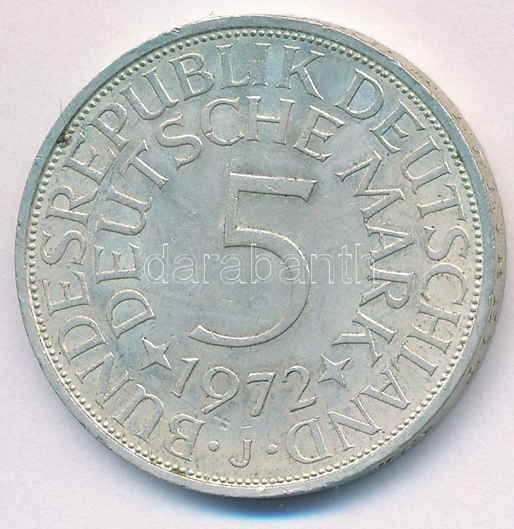 GFR 1972J 5 Mark Ag C:XF https://www.darabanth.com/hu/272-Gyorsarveres/272.0/Numizmatika/Kulfoldi-fem-es-ezustpenzek~300013/NSZK-1972J-5M-Ag-T2---GFR-1972J-5-Mark-Ag-CXF~II1387401