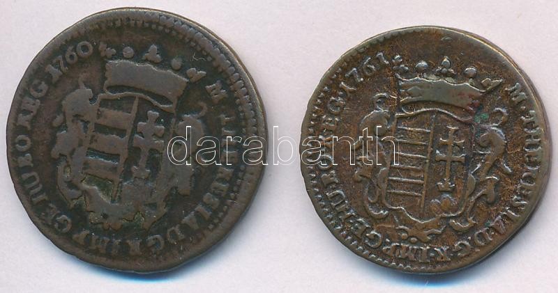 Leírás: 1760-1761. Rézdenár "Mária Terézia" nyílt koronás (2x) T:2-,3 Huszár: 1755., Unger III.: 1277.