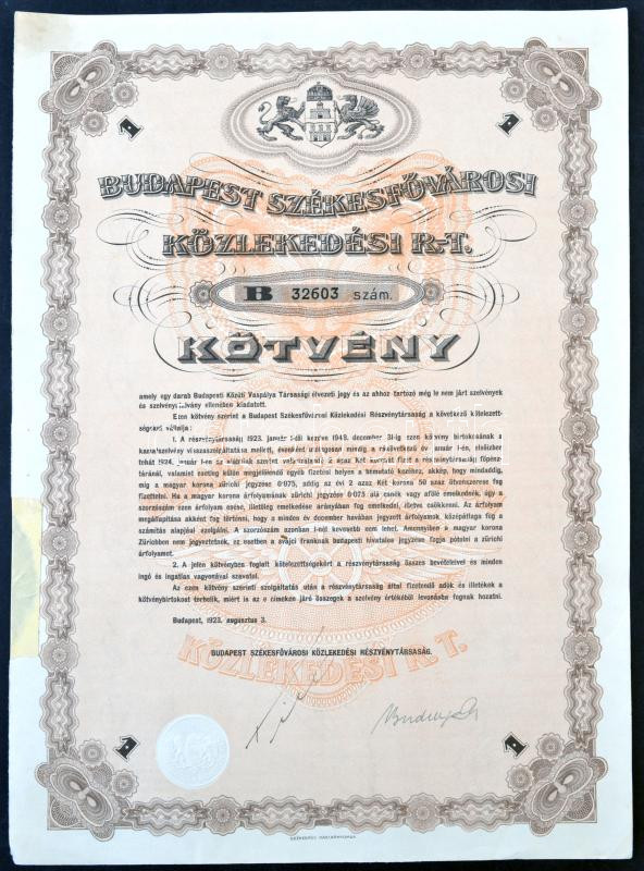 Budapest 1923. "Budapest Székesfővárosi Közlekedési R.-T." k... https://www.darabanth.com/hu/272-Gyorsarveres/272.0/Numizmatika/Reszvenyek-es-sorsjegyek~300005/Budapest-1923-Budapest-Szekesfovarosi-Kozlekedesi-R-T-kotvenye-szarazpecsettel-szelv~II1381280