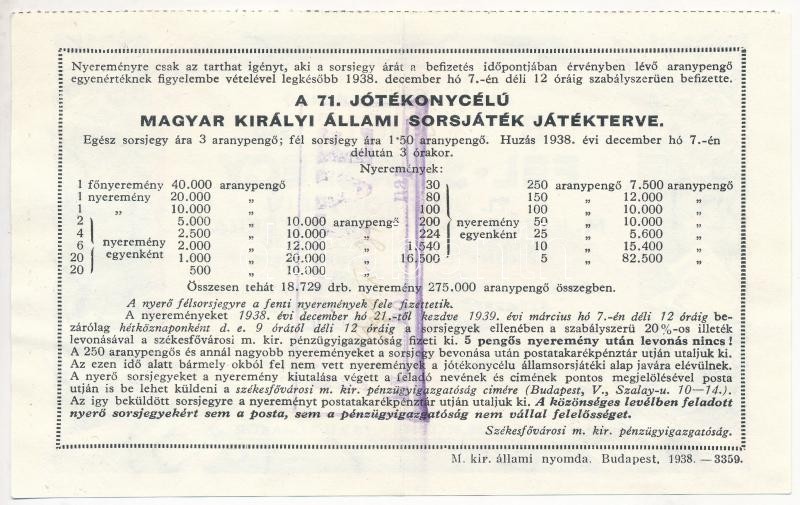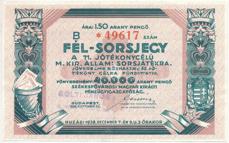 Leírás: Budapest 1938. "A 71. Magyar Királyi Állami Sorsjáték" 1,50 Aranypengő értékű fél-sorsjegye, csillagozott sorszámmal, pecsételéssel T:II