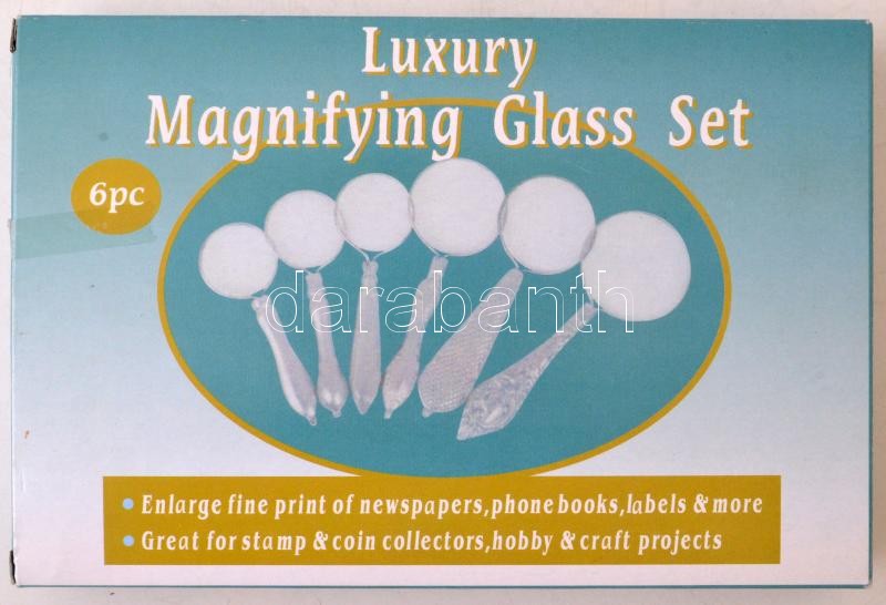 Leírás: 6 darabos nagyító készlet eredeti dobozában, kiváló állapotban, 22x15 cm., m: 10-12 cm.