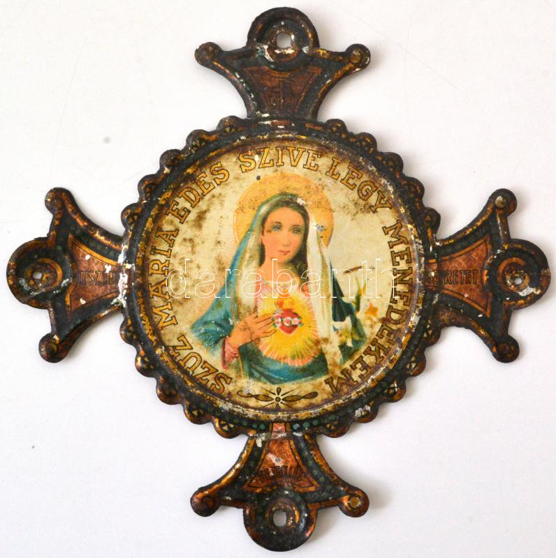 Leírás: Mária szíve pajzs, fém, kopottas állapotban, 12x12cm