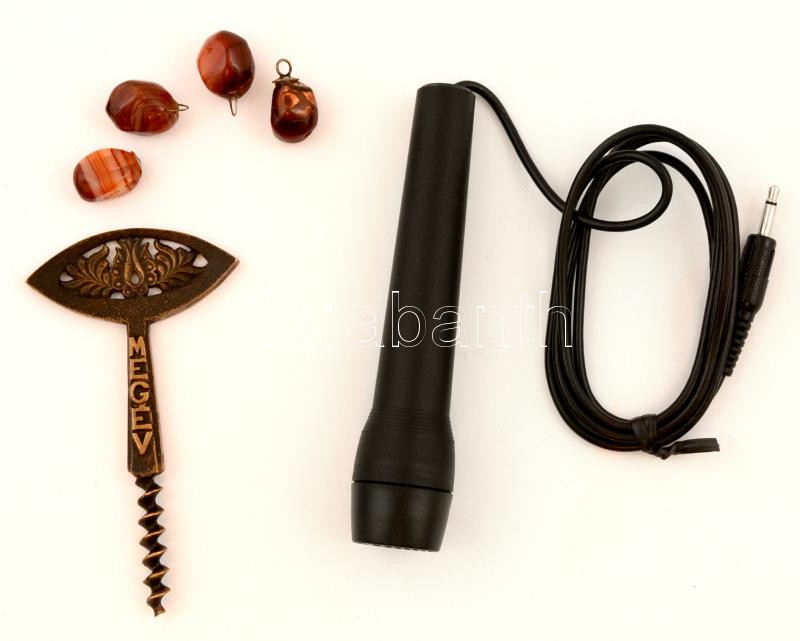 Leírás: Mikrofon (nem kipróbált), réz dugóhúzó, 4 db achát kő