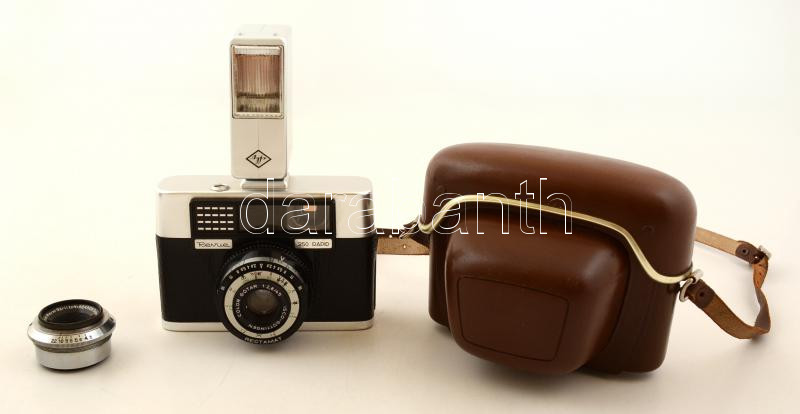 Leírás: Revue 250 Rapid fényképezőgép+ISCO-Göttingen Color Gotar 1:2,8/45 objektívvel,eredeti bőrtokban. + Meyer-Görlitz objektív+Agfatronic 140 A vaku.