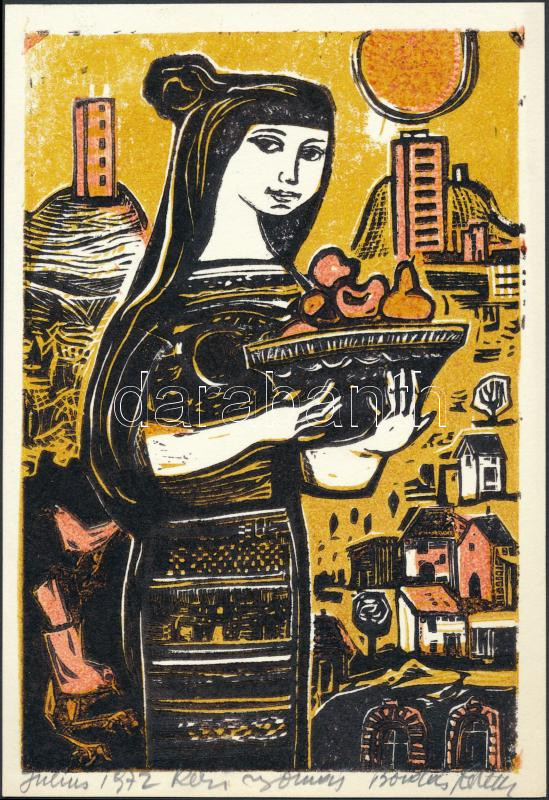 Leírás: Bordás Ferenc (1911-1982): Nő gyümölcsös tállal. Színes linó, papír, jelzett, 18×12 cm