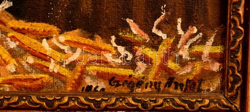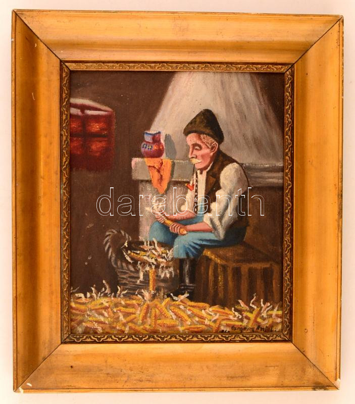 Leírás: Czigény Antal (?-?): Kukoricahántás. Olaj, vászon, sérült, keretben, 29×24 cm
