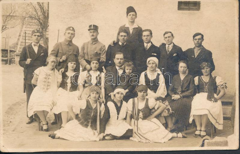 cca 1916-1918 Pomázi társaság, lányok népviseletben, fiúk katonai egye... https://www.darabanth.com/hu/273-Gyorsarveres/273.0/Festmeny-mutargy-papirregiseg-egyeb/Foto~37/cca-1916-1918-Pomazi-tarsasag-lanyok-nepviseletben-fiuk-katonai-egyenruhaban-fotolap-9x1~II1391084