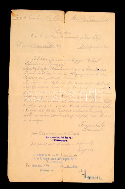 Leírás: 1916 A k.u.k. 2. Armee Kommadonak címzett levél hadnagy szabadságolása ügyében egyetemi tanulmányok miatt