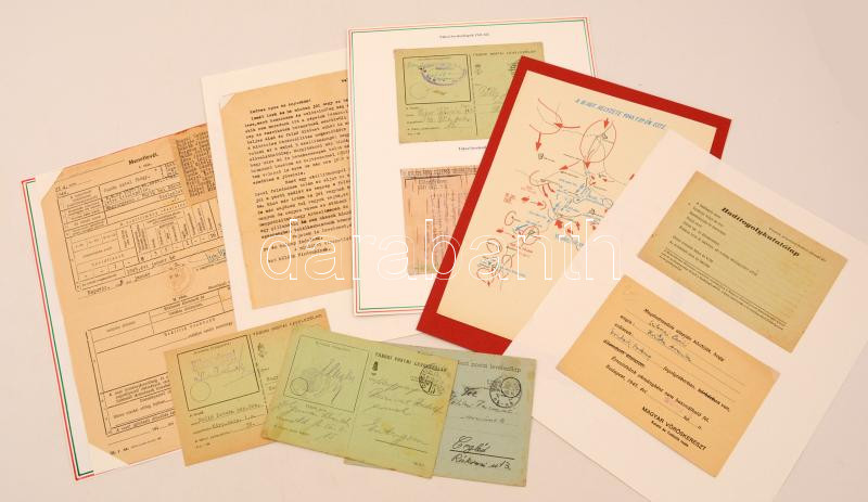 Leírás: 1944-1945 A harcok befejezte után: hadifogoly táborból küldött levél, hadifogoly kutató lap, tábori levelezőlapok.