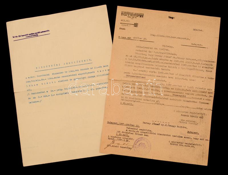 1944, 1947 Bp., M. kir. 5/1 honvéd vadász repülő pótosztály parancsnokságának jegyzőkönyve, a honvédelmi minisztérium által a közp. illetm. hiv. honv. csoportjának címzett levél, 2 db
