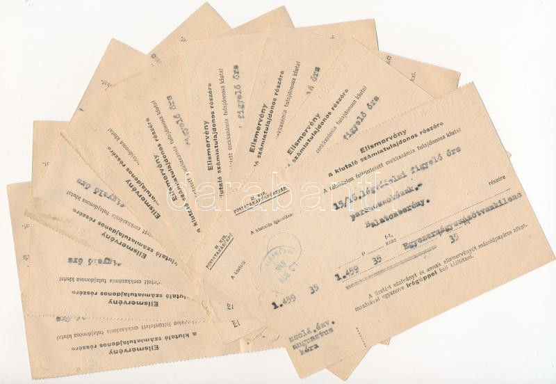 Leírás: 1944 Katonai zsoldfizetési elismervény légvédelmi figyelő őrs parancsnokságának, 7 db különböző