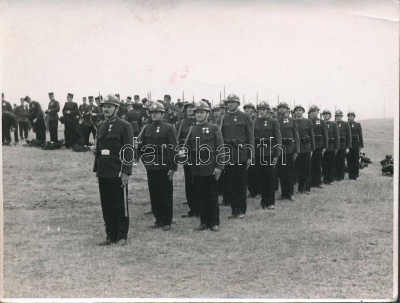 Leírás: cca 1940 Gyakorlatozó rendőrök. A M. kir rendőrség Budapesti Rendőri Őrségének Főparancsnoksága. 12x9 cm