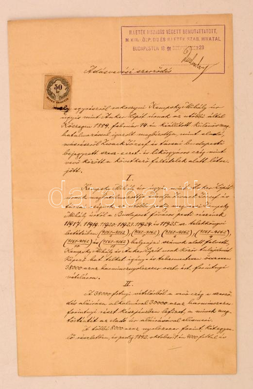 Leírás: 1891 Kempszky Mihály úgyis mint Anker Lipót meghatalmazottja ingatlan adásvételi szerződést köt Zwack Józseffel, pp.:3, 34x21cm