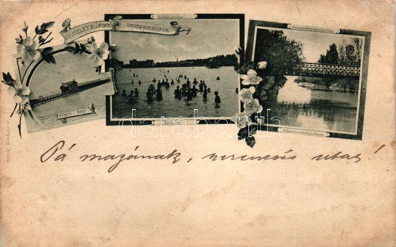 Leírás: Siófok, Fürdő, Sió csatorna a vasúti híddal, floral, kiadja Szálé (vágott / cut)