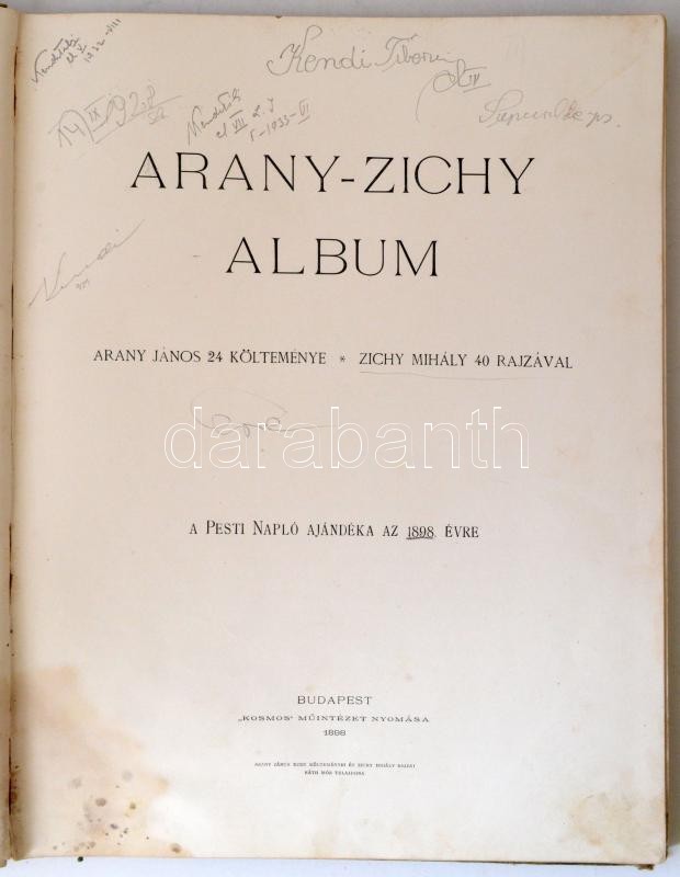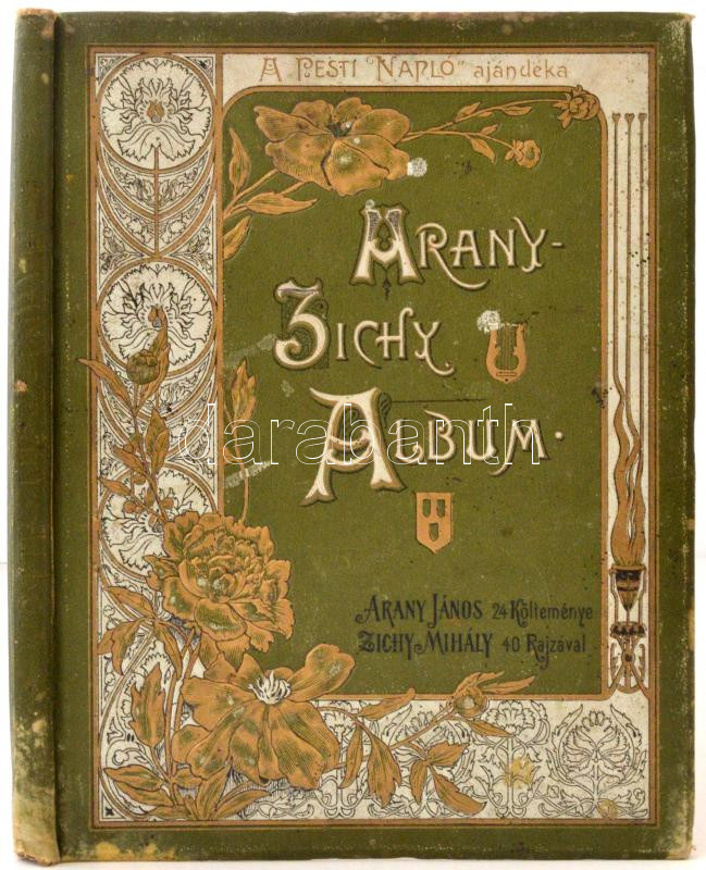 Arany-Zichy Album. Arany János 24 költeménye. Zichy Mihály 40 rajzával. A Pesti Napló ajándéka az 1898. évre. Budapest, 1898, Kosmos Műintézet, XV+77 p. Kiadói aranyozott, festett, egészvászon kötés, festett lapélekkel. Megviselt állapotban!