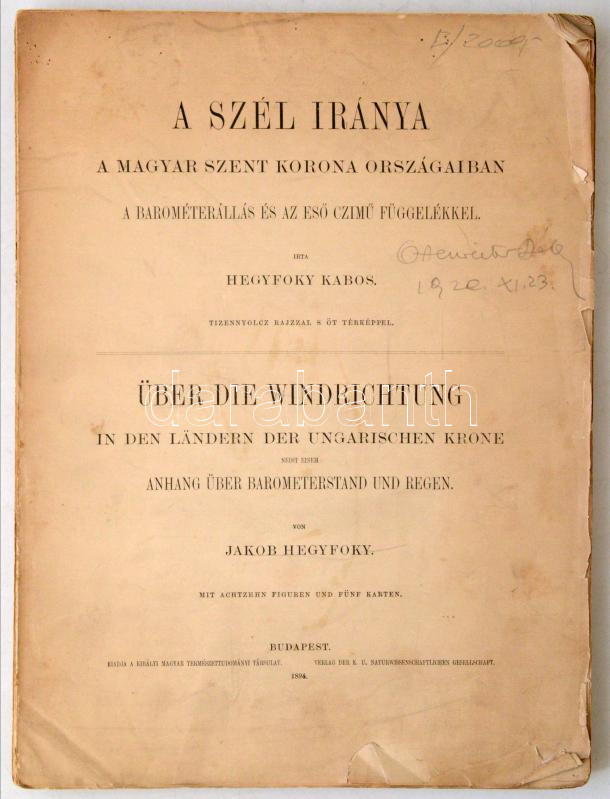 Hegyfoky Kabos: A szél iránya a Magyar Szent Korona országaiban a baromméterállás és az eső című függelékkel. Bp., 1894, Királyi Magyar Természettudományi Társulat. Papírkötés, megviselt állapotban.
