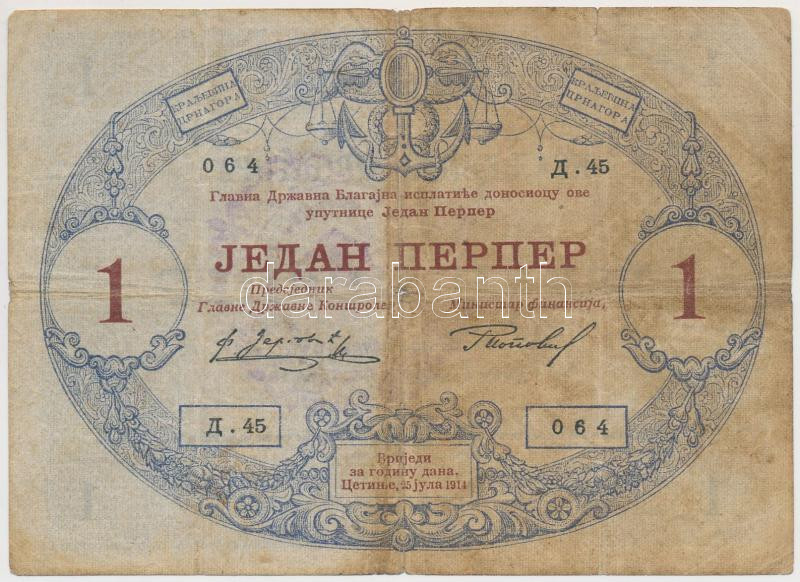 Montenegro 1914. 1 Perper C:VG hole https://www.darabanth.com/hu/273-Gyorsarveres/273.0/Numizmatika/Kulfoldi-bankjegyek~300013/Montenegro-1914-1P-TIII-ly--Montenegro-1914-1-Perper-CVG-hole~II1393956
