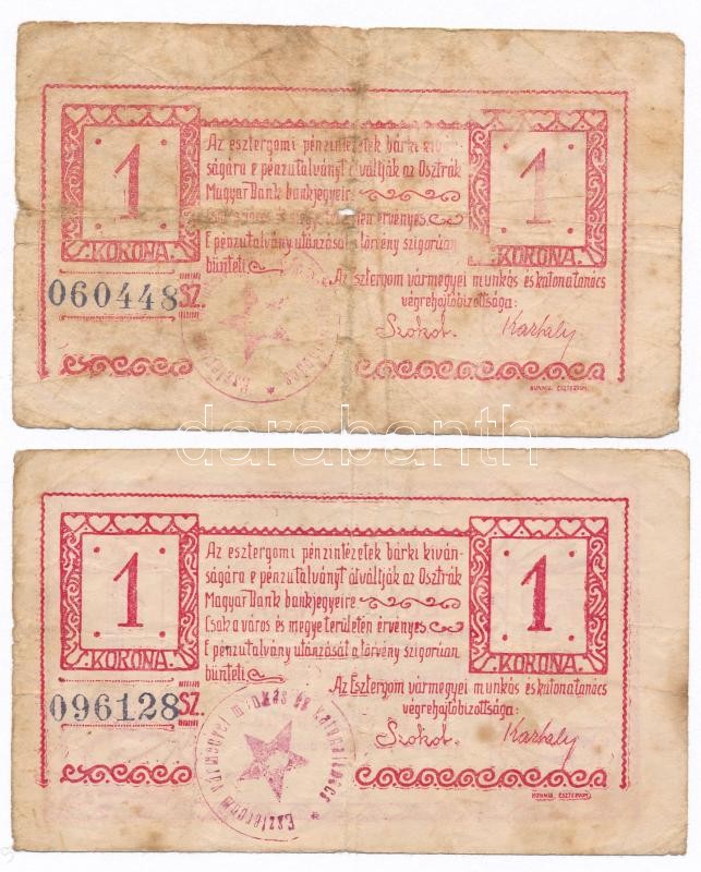 Leírás: Esztergom 1919. 1K "Esztergomi Pénzintézetek Utalványa" felülbélyegzett (2x) T:III,III-