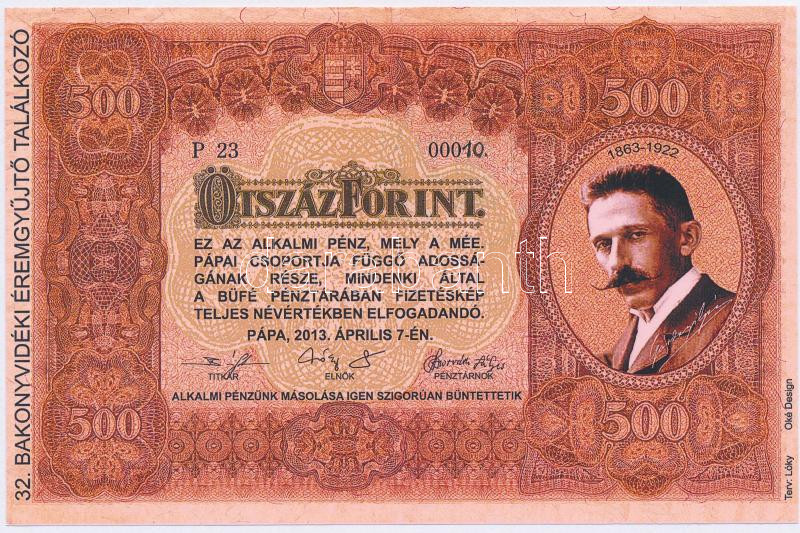 Leírás: Pápa 2013. "13. Pápai Érem- és Fegyverbörze" 500Ft alkalmi pénz, hátlapján "Magyar Éremgyűjtők Egyesülete - Pápai Csoport 1970" felülbélyegzéssel T:I