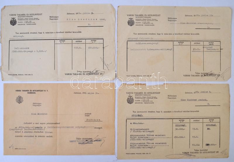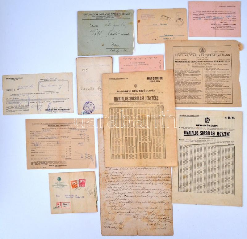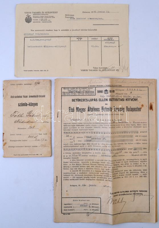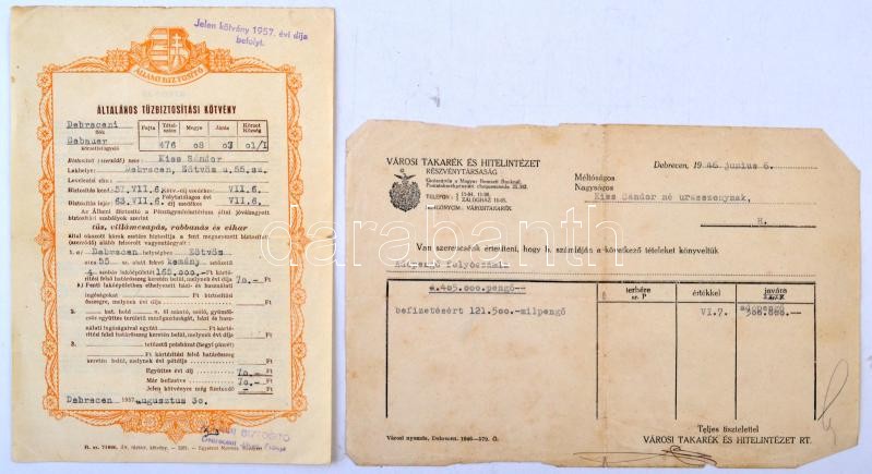 Leírás: Vegyes okmány tétel, közte Budapest 1941. "Első Magyar Általános Biztosító Társaság" betöréses-lopás elleni biztosítási kötvénye, Nádudvar 1902. "Alsó-szabolcsi Tiszai Ármentesítő-társulat" számlakönyve, Debrecen 1946. "Városi Takarék és Hitelintézet Részvénytársaság" elismervénye folyószámla befizetésről (6x), Debrecen 1957. "Állami Biztosító" általános tűzbiztosítási kötvénye + 27db-os vegyes papírrégiség közte adásvételi szerződés, iparigazolvány, ajánlólevél