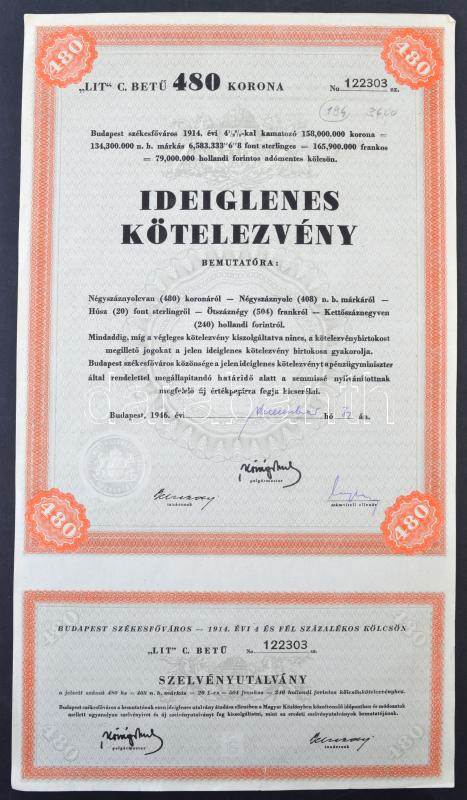 Leírás: Budapest 1946. "Budapest székesfőváros 1914. évi 4 1/2% -kal kamatozó 158.000.000 korona adómentes kölcsön" ideiglenes kötelezvénye 480K-ról, szárazpecséttel, szelvényutalvánnyal T:II szakadás