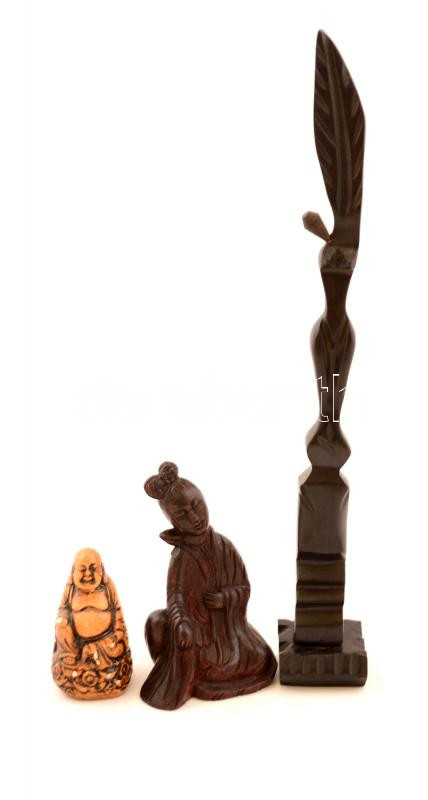 Leírás: 3 db keleti motívumos tárgy: 2 db Buddha-szobor, m: 11 ill. 7 cm, 1 db asztaldísz, m: 29 cm