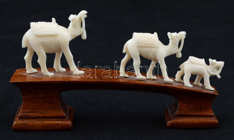 Leírás: Tevék, csont figurák fa talapzaton, 9,5×5×2 cm