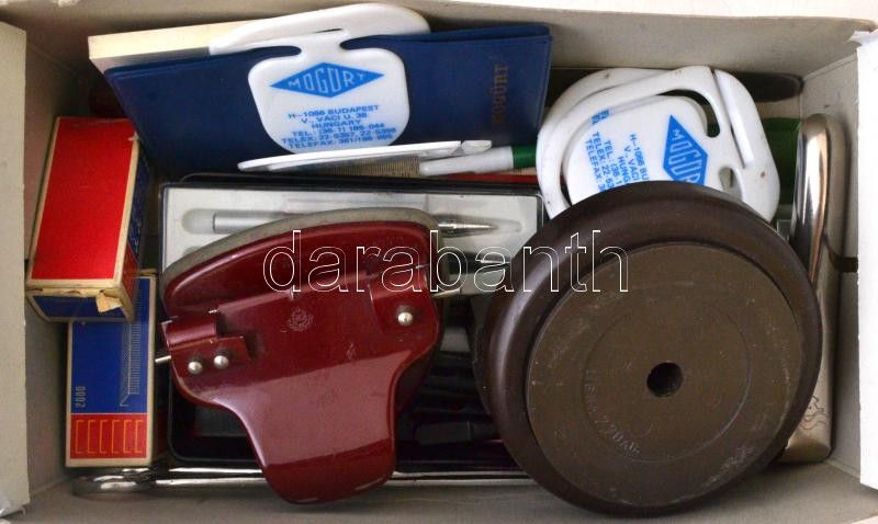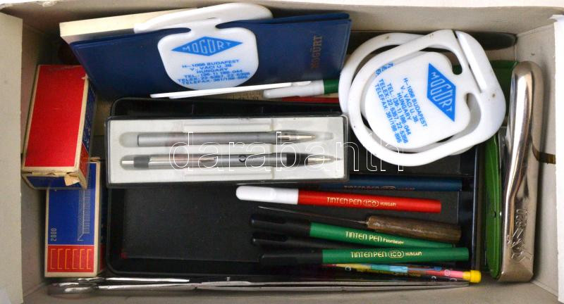 Leírás: Vegyes régi és modern írószer készlet, cipős dobozban.