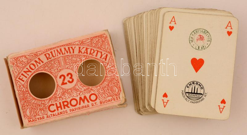 cca 1910 Finom Rummy kártya, bontott csomagolásban, 54 lap, Chromo Magyar Általános Papiripar Rt., a doboza szakadt, a lapok alapvetően jó állapotban, 10x8 cm.