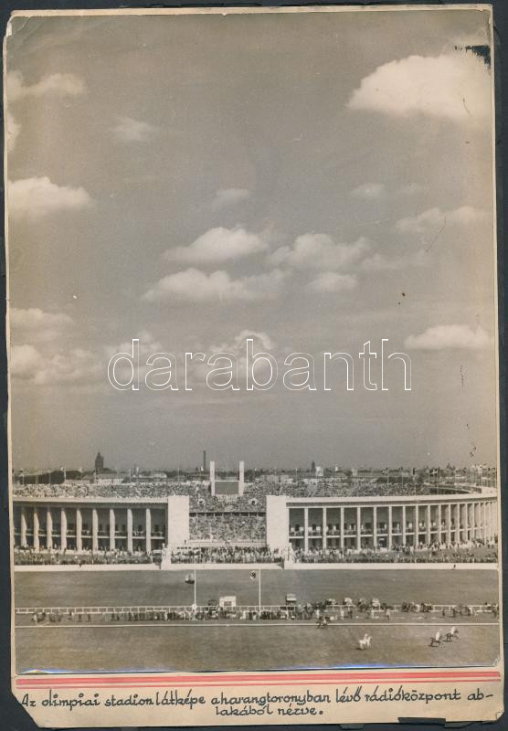 1936 Berlin, az olimpiai stadion látképe a harangtoronyban lévő rádióközpont ablakából nézve; fotó kartonon, feliratozva, szélei töredezettek / Berlin Olympic Stadium photo 18×26 cm