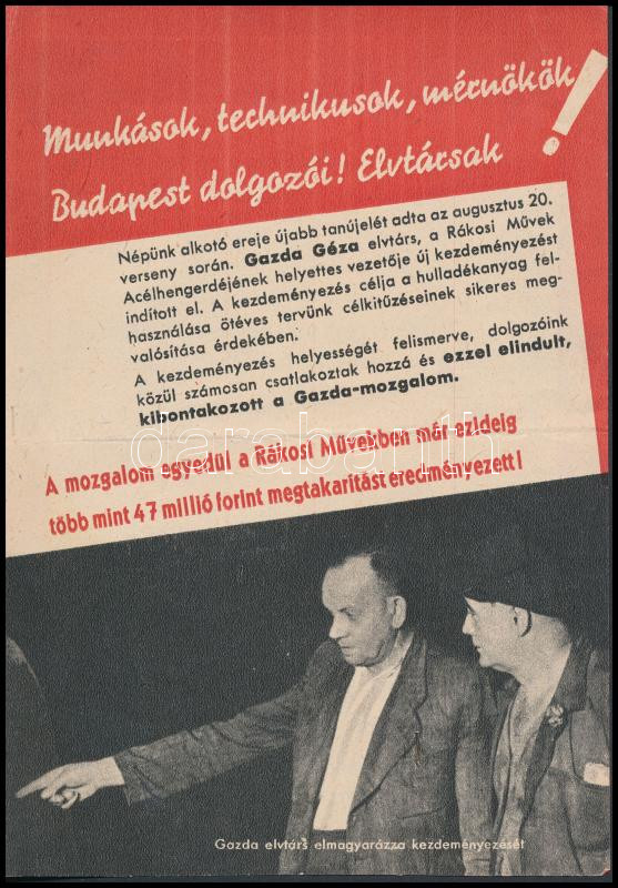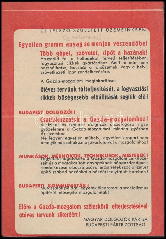 cca 1950-1956 Bp., "Munkások, technikusok, mérnökök!..." a Gazda-mozga... https://www.darabanth.com/hu/274-Gyorsarveres/274.0/Festmeny-mutargy-papirregiseg-egyeb/Nyomtatvanyok~28/cca-1950-1956-Bp-Munkasok-technikusok-mernokok-a-Gazda-mozgalom-szorolapja-20x14-cm~II1399638