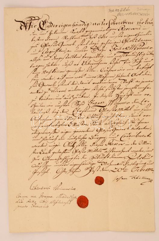 1802 Német nyelvű szerződés viaszpecsétekkel https://www.darabanth.com/hu/274-Gyorsarveres/274.0/Festmeny-mutargy-papirregiseg-egyeb/Okmanyok~16/1802-Nemet-nyelvu-szerzodes-viaszpecsetekkel~II1400185