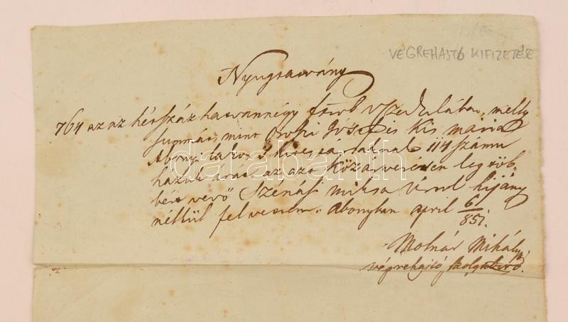Leírás: 1851 Abony, Végrehajtó által ház árának felvételéről szóló nyugtatvány