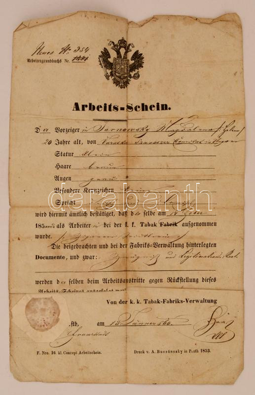 1860 Tabak-Fabrik munkáltatói igazolás (Arbeits-Schein), szárazpecsétt... https://www.darabanth.com/hu/274-Gyorsarveres/274.0/Festmeny-mutargy-papirregiseg-egyeb/Okmanyok~16/1860-Tabak-Fabrik-munkaltatoi-igazolas-Arbeits-Schein-szarazpecsettel-nemileg-foltos-gyu~II1397924