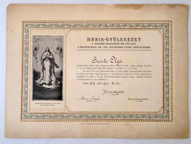 1917 Mária-Gyülekezet, A "Magyarok Nagyasszonyá"-nak címe alatt a Miasszonyunkról Nev. Szeg. Iskolanővérek Polgári Leányiskola oklevele, Lippa, némi folttal, gyűrődéssel, 39x29 cm.