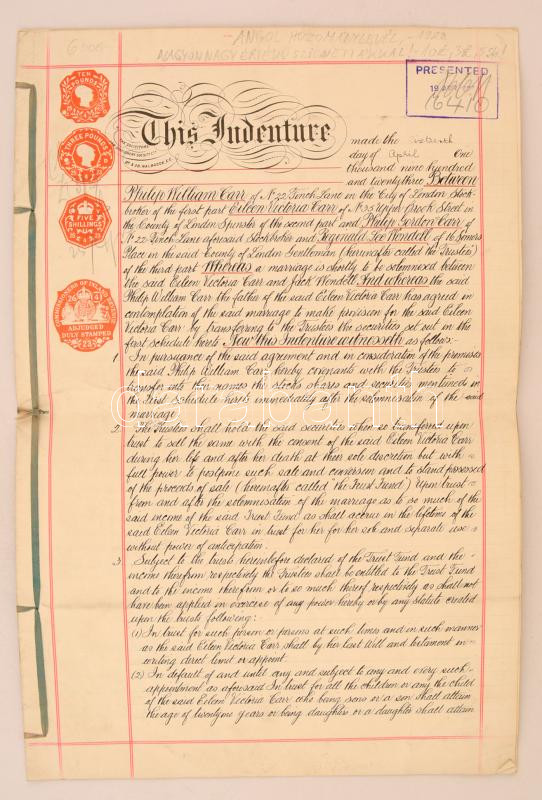 Leírás: 1923 Angol hozománylevél nagy összegű szignettákkal / marriage settlement