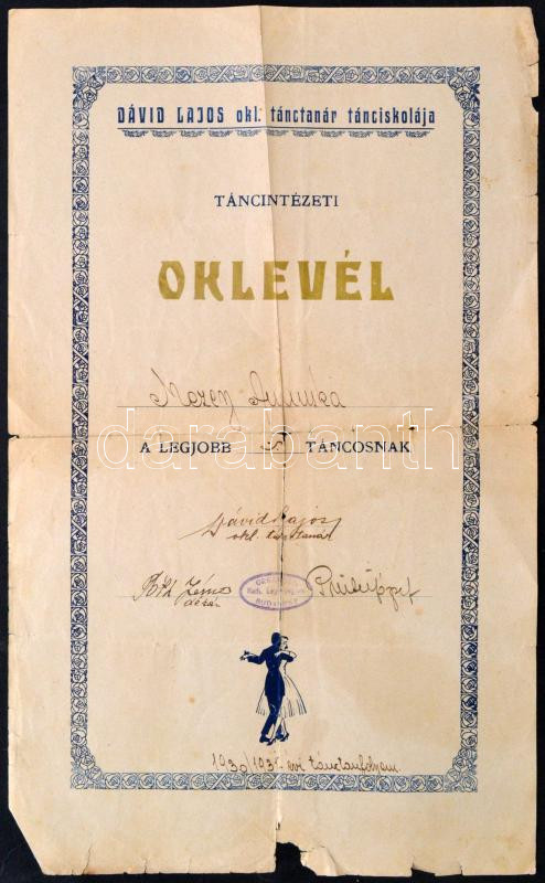 1931 Dávid Lajos tánciskolájának táncintézeti oklevele a legjobb tánco... https://www.darabanth.com/hu/274-Gyorsarveres/274.0/Festmeny-mutargy-papirregiseg-egyeb/Okmanyok~16/1931-David-Lajos-tanciskolajanak-tancintezeti-oklevele-a-legjobb-tancos-reszere-megviselt-~II1400438