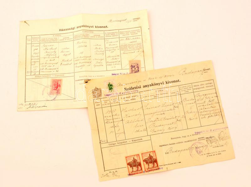 1938, 1947 Bp., Születési és házassági anyakönyvi kivonat okmánybélyeg... https://www.darabanth.com/hu/274-Gyorsarveres/274.0/Festmeny-mutargy-papirregiseg-egyeb/Okmanyok~16/1938-1947-Bp-Szuletesi-es-hazassagi-anyakonyvi-kivonat-okmanybelyegekkel-2-db-az-1947-e~II1400364