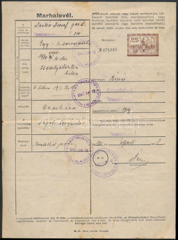 Leírás: 1942-1943 2 db marhalevél Békés megyéből okmánybélyegekkel