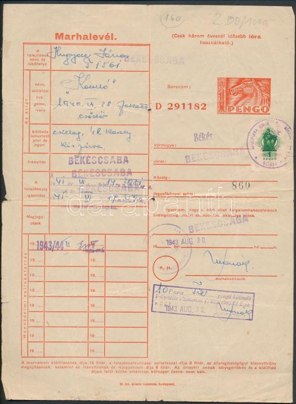 1942-1943 2 db marhalevél Békés megyéből okmánybélyegekkel https://www.darabanth.com/hu/274-Gyorsarveres/274.0/Festmeny-mutargy-papirregiseg-egyeb/Okmanyok~16/1942-1943-2-db-marhalevel-Bekes-megyebol-okmanybelyegekkel~II1400040