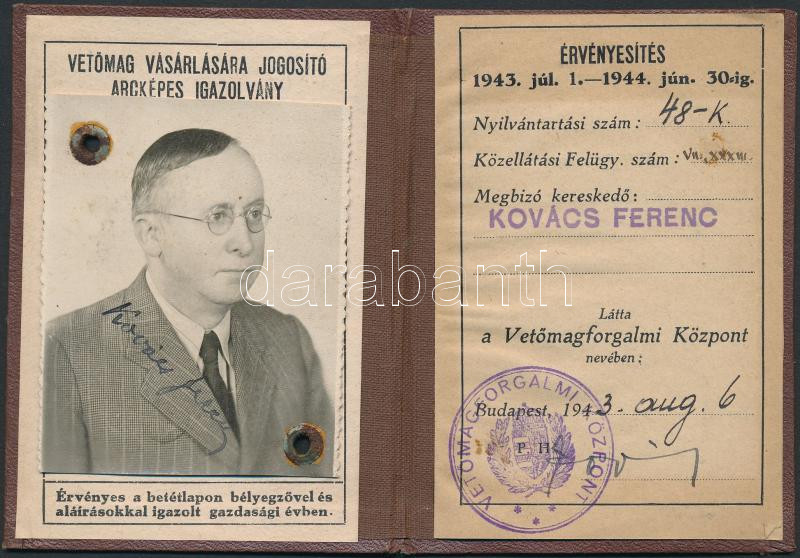 1943 Bp., Vetőmag vásárlására jogosító arcképes igazolvány https://www.darabanth.com/hu/274-Gyorsarveres/274.0/Festmeny-mutargy-papirregiseg-egyeb/Okmanyok~16/1943-Bp-Vetomag-vasarlasara-jogosito-arckepes-igazolvany~II1401602