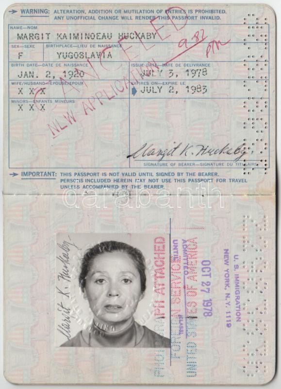 1978 Amerikai Egyesült Államok útlevele jugoszláv születésű hölgy (Nemzetes vitéz Huckaby K. Margit) részére, pp.:24, 12x9cm / US. passport for Yugoslav-born lady (Nemzetes vitéz Huckaby K. Margit) , pp.:24, 12x9cm