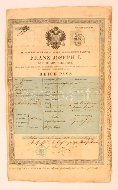 cca 1860 Pest (Ofen), Ferenc József nevében kiállított útlevél, német nyelven, pecsétekkel, köztük a Magyar Királyi Helytartóság pecsétjével, foltos. / K.u.k. passport.